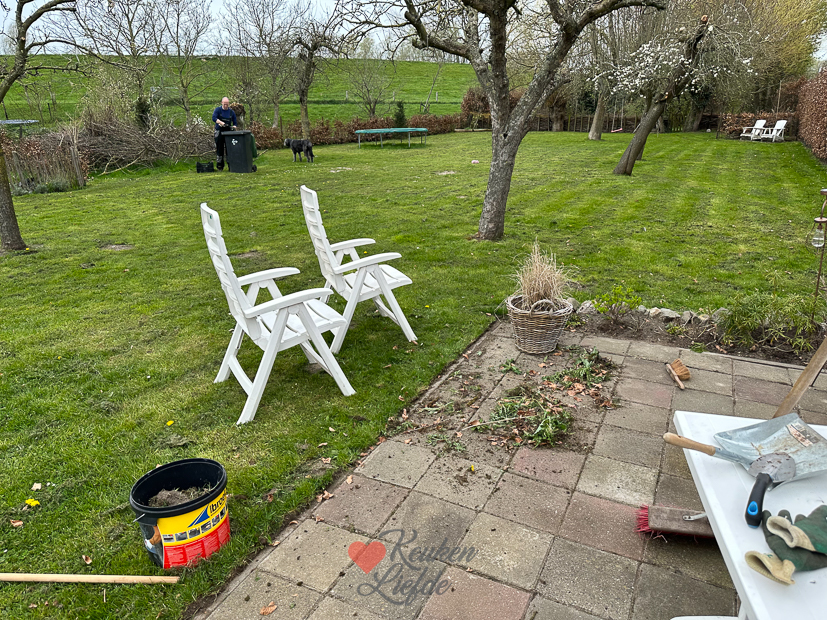 We vermaken ons deze Tweede Paasdag de hele dag buiten in de tuin met onkruid trekken en snoeien. Geen straf hoor, werken in de tuin. Het is heerlijk zen en gezellig om samen zo bezig te zijn. Tussendoor maakt Johan een lekkere lunch klaar. Eind van de middag begint het te regenen en zijn we net klaar. We kleden ons om en ploffen in de keuken neer voor een drankje. ’s Avonds eten we heel makkelijk met frietjes en gebakken zalm.