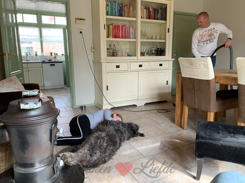 Het huis moet ook weer schoongemaakt worden. Nu we met z’n allen elke dag thuis zijn wordt het huis veel sneller vies dan normaal. Zeker met een hond en twee katten in huis is stofzuigen een dagelijks terugkomend klusje.