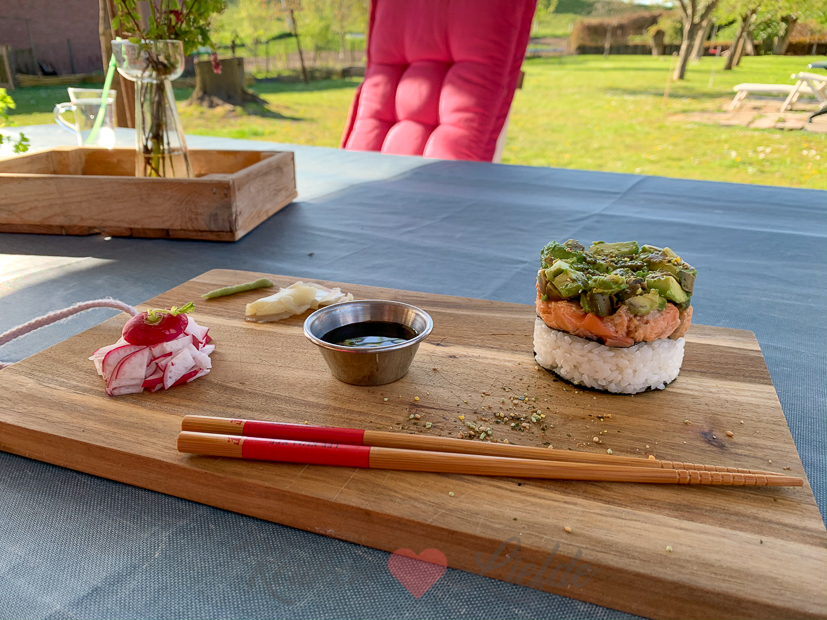Hoi Ingrid, sushitaartje is heel simpel. Gewoon sushirijst koken volgens de bereiding op het pak en op smaak brengen met sushiazijn. Een stukje zalm mi-cuit garen in sojasaus en dan lostrekken met een vork. Avocado in plakjes snijden of prakken. In een kookring op maat geknipt norivel leggen, dan sushirijst, dan weer een norivel en dan zalm en avocado. Serveren met sojausaus, wasabi, ingelegde gember en eventueel wat furikake. Zal het recept binnenkort nog wel een keer maken en het uitschrijven en delen. 🙂