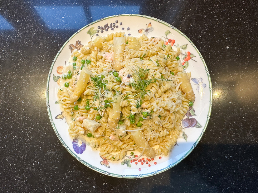 Vanavond staat er een lekkere pasta op het menu met asperge, zalm en roomsaus. Recept: Zalm kruiden met zout en peper en net gaar bakken in de koekenpan in een scheutje olie. Leg op een bord en zet opzij. Breng een pan met water aan de kook en kook hierin de pasta en de geschilde stukken witte asperge (de asperge mag er een minuut later bij). Voeg de laatste paar minuten van de kooktijd ook een handje diepvriesdoperwten toe. Ondertussen fruit je een sjalotje aan in een koekenpan (het achtergebleven bakvet van de zalm heeft veel smaak, dus gebruik dezelfde pan) in een scheutje olijfolie. Dan afblussen met een scheutje droge witte wijn en iets laten inkoken (of laat de wijn achterwege). Dan verkruimelde groentebouillontablet erbij en 150 ml room en 150 ml kookvocht van de pasta en asperges. Breng de saus aan de kook en laat zachtjes pruttelen tot hij iets dikker is. Breng op smaak met zwarte peper uit de molen. Heb je te weinig saus, voeg dan wat meer bouillon en/of room toe. Is de saus te dun, laat hem dan wat langer inkoken. Trek de zalm uit elkaar. Giet de pasta af en laat uitlekken. Roer de pasta, asperges, doperwten en zalm door de saus en warm nog even door. Ik strooide nog een beetje parmezaan en tuinkers over de pasta. Smakelijk!