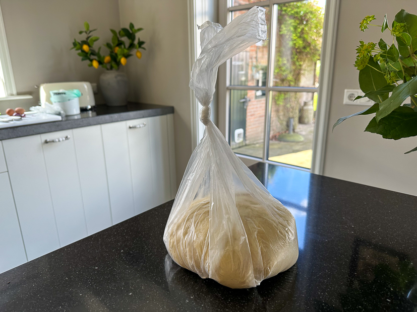 Ik laat het deeg rijzen in een afgesloten pedaalemmerzak die ik eerst lichtjes heb bestrooid met bloem.