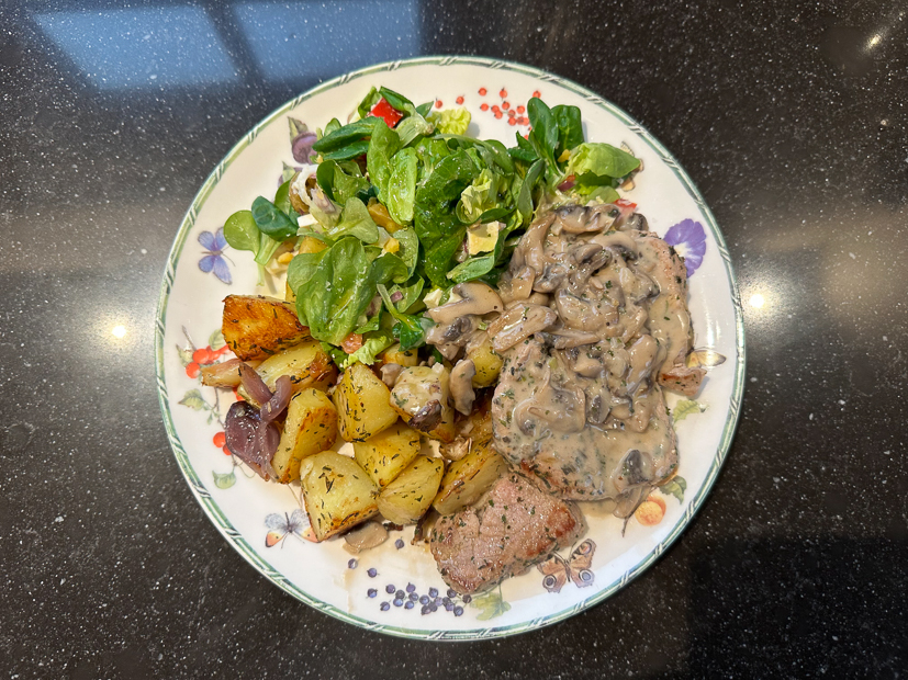 Ella heeft vandaag een voetbalwedstrijd thuis en terwijl zij op het voetbalveld staat zijn Johan en ik thuis aan het rommelen. Er wordt hout gehaald en er worden weer een paar meubelstukken verplaatst. ’s Middags rijden we nog even naar het tuincentrum en halen we boodschappen. Weer thuis begin ik alvast met de voorbereidingen voor het avondeten. Ik schil aardappels en pel een rode ui en doe die alvast met een klein bodempje kippenbouillon, een royale scheut olijfolie, rozemarijn en tijm en zout en peper in een braadslee. Ook snij ik twee varkenshaasjes in medaillons en kruidde die met salie, basilicum, peterselie, gemberpoeder, citroengraspoeder, korianderpoeder en zout en peper. Scheutje zonnebloemolie erbij, goed mengen, afdekken met vershoudfolie en in de koelkast bewaren. Daarna maak ik champignonroomsaus volgens dit recept. Voor Ella had ik peperroomsaus in huis gehaald want die houdt niet zo van champignons. En tot slot maak ik een honing-mosterddressing (grootste deel milde olijfolie, iets minder zoetzuur augurkennat en gelijke delen honing en mosterd) voor over de salade die Johan ’s avonds maakt. Voordat we gaan eten ’s avonds wordt er eerst een aperitiefje gedronken bij de houtkachel. De aardappeltjes worden gebakken in een voorverwarmde oven op 200 graden circa 30 minuten, of tot ze goudbruin zijn. Halverwege de tijd zal de bouillon verdampt zijn en kunnen de aardappeltjes goudbruin kleuren. Schep ze halverwege een keer om. Als de aardappels bijna goed zijn bak je de varkenshaasje met wat olie in de koekenpan en warm je de sauzen op. Aardappels, vlees en saus serveren met de salade en dressing.