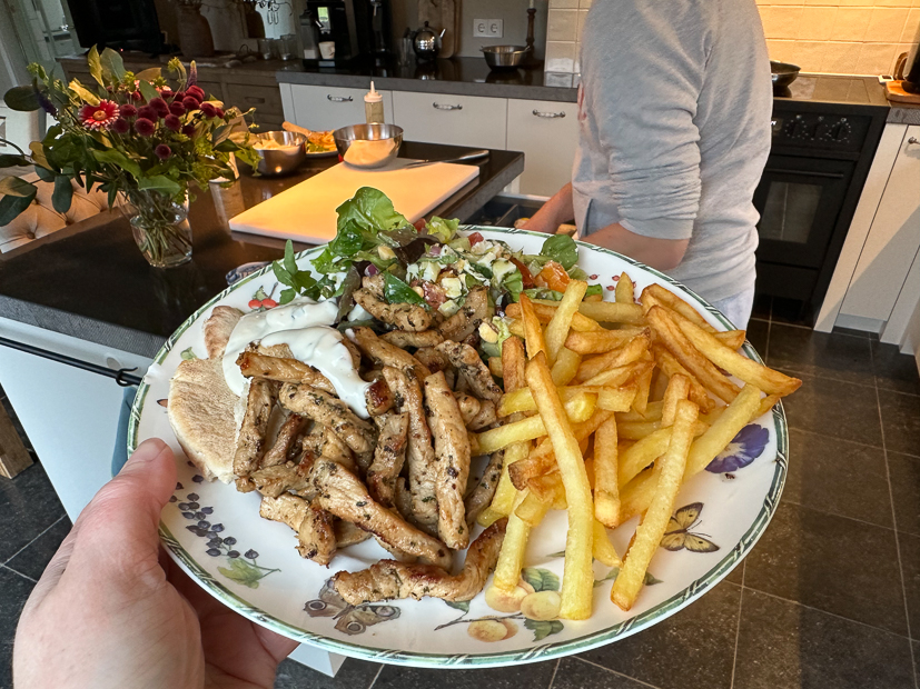 Vandaag staat er niks op de planning en doen we lekker rustig aan. We slapen uit, ontbijten samen en rommelen wat in huis. Ella wil ’s avonds graag shoarma eten dus halen we daar nog wat boodschappen voor. Dit keer maak ik shoarma van à la minute varkensfiletlapjes die ik lichtjes kruid met dezelfde kruiden als gisteren en erbij eten we frietjes uit de aerofryer, pitabrood (Johan en ik vullen ons pitabrood nooit maar scheuren het in stukken), salade en knoflooksaus.