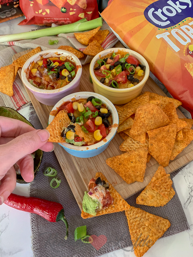 Voor een samenwerking ga ik aan de slag met de Tortilla Nacho Cheese en de Chili Mild & Sweet van Croky en maak ik een heerlijke dip (met o.a. guacamole, tomatensalsa en zure room) om erbij te serveren. Ik had de smakelijke tortillachips en dip onlangs al een keer op tafel gezet als borrelhapje en dit werd meer dan goedgekeurd door het strenge testpanel Johan en Ella-Marie. Alle bakjes gingen namelijk schoon leeg! 🙂 Ik maak de dip nu nog een keer om op de foto te zetten en deel het recept gelijk op IG. Heb jij de dip en de tortillachips al geprobeerd? Laat me in een reactie hieronder weten wat je ervan vindt! 🙂