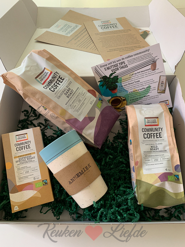 Verder krijgen we een leuk pakketje thuisbezorgd van Fairtrade Original met hun Community Coffee. Deze koffie wordt zonder tussenschakels rechtstreeks ingekocht bij fairtrade en biologische koffiecoöperatie Red Ecolsierra uit Colombia. Hier lees je meer over deze koffie. De leuke thermosbeker met mijn naam erop heeft Johan direct ingevorderd. 🙂 Vooruit, hij zit voor zijn werk dagelijks veel in de auto dus zo’n mok die hij ’s ochtends thuis kan vullen met goede koffie is hem meer dan gegund!