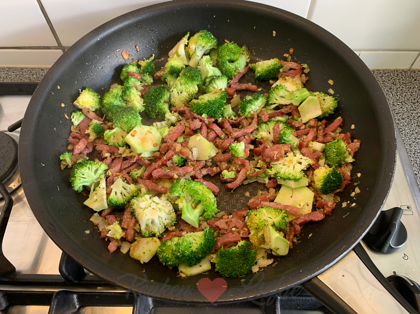 Voor het avondeten maak ik pasta met romige kaassaus, bacon en broccoli. Mmmm… Ik maakte ongeveer dit recept.