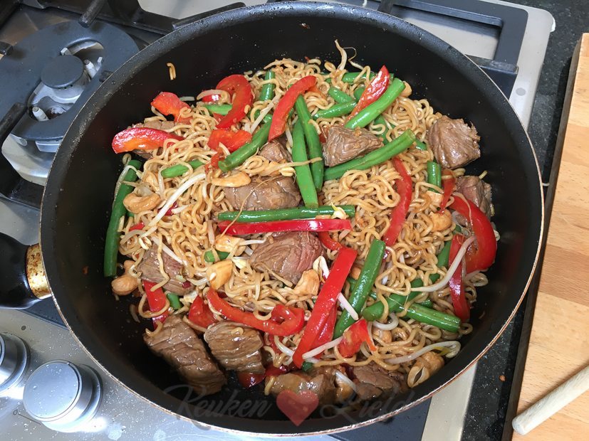 Hoi! Dit kijkje in de keuken en de volgende twee staan volledig in het teken van het kookboek KOKEN MET KEUKENLIEFDE: mijn allereerste kookboek dat dit najaar in de boekhandels ligt en bomvol staat met lekkere HOOFDGERECHTEN VOOR ELKE DAG. De gerechten zijn onderverdeeld in de hoofdstukken vis, vlees, kip en vega. Makkelijk toch? De aankomende drie weken (als je dit leest nog twee weken) kook ik vijf dagen per week een paar hoofdgerechten voor het kookboek. Vandaag maak ik onder andere dit heerlijke gerecht met biefstuk en noedels.