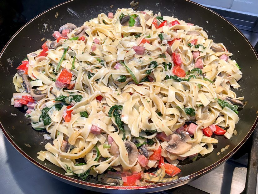 Als we het ontbijt op hebben maak ik een grote pan tagliatelle met romige ham, champignons en spinazie voor het avondeten. Dat kan alvast maar klaar zijn. 😉 Het recept ga ik binnenkort met je delen op KeukenLiefde. Hij was erg lekker!