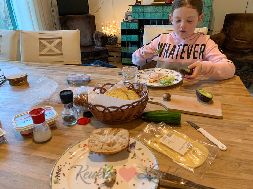 Als Ella-Marie ’s middags uit school komt gaan we gezellig samen lunchen. Momenteel is Ella haar favoriete lunch een boterham besmeerd met roomkaas en belegd met avocado en kipfilet. Mijn huidige lunchfavoriet is een boterham besmeerd met pindakaas en belegd met kipfilet, sambal, komkommer en gefrituurde uitjes. Smullen!