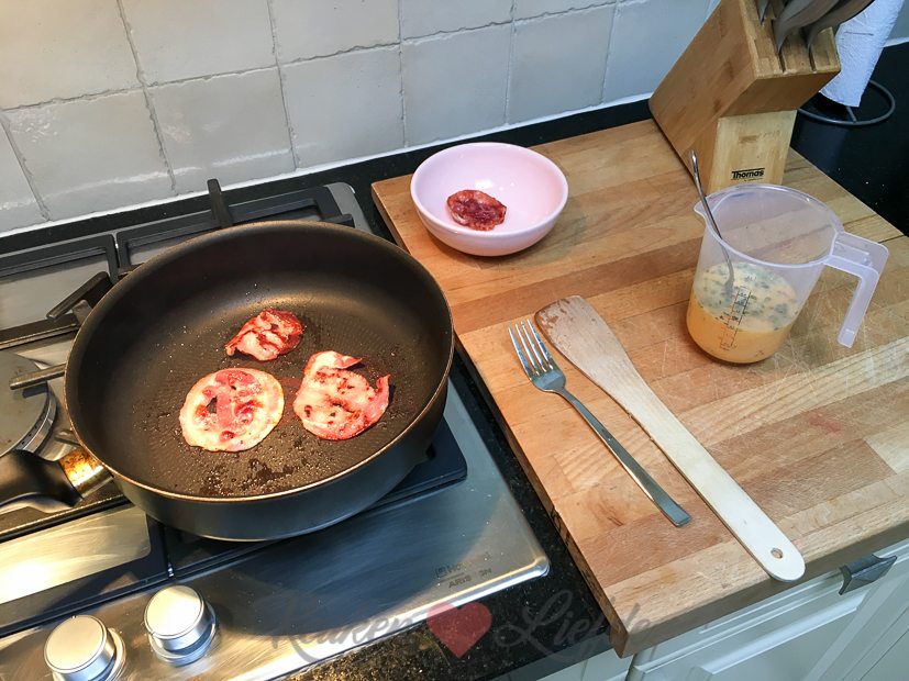 Eerste Pinksterdag. Johan maakt roerei en bakt bacon uit voor het ontbijt.