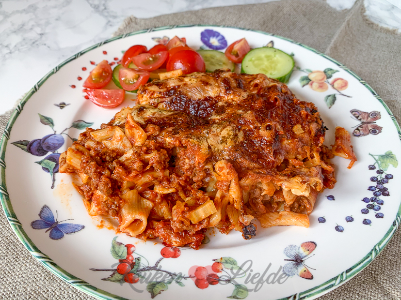 Omdat het kouder weer is heb ik zin in een hartverwarmende ovenschotel: lasagne! Tijdens het koken kom ik erachter dat ik geen lasagnebladen meer heb. Ik heb nog wel een zak mini penne liggen dus gooi ik die maar door de bolognesesaus.