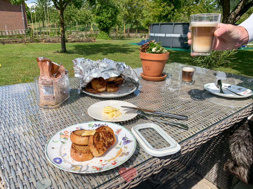 Ik heb nog een stokbrood liggen waarmee je inmiddels een krater in een pakje boter kunt slaan. Met een versgeslepen broodmes lukt het me nog net om er plakjes van te snijden. Wentelteefjes tijd!