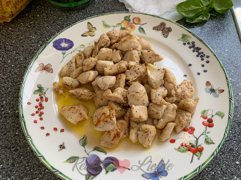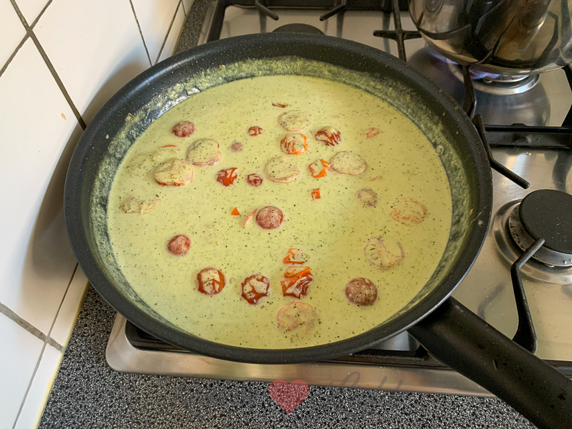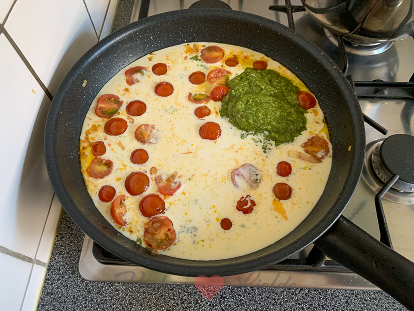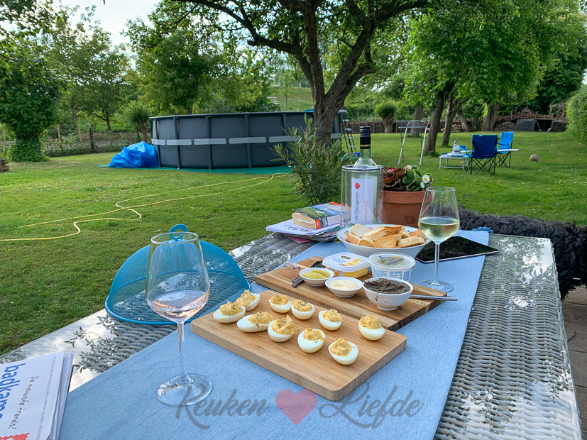 Helaas is het ’s avonds niet warm genoeg om buiten te eten. Geeft niks, binnen is het ook gezellig. Ik maak pasta pesto met kip (gezinsfavoriet! Ongeveer dit recept maar dan met kip) en die eten we met het bord op schoot voor de tv. Tegenwoordig vaste prik op zaterdagavond.