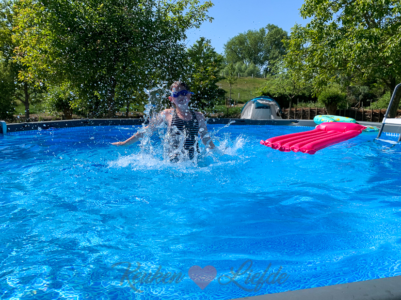 Ella-Marie heeft vandaag een thuiswerkdag en als het schoolwerk af is mag ze zwemmen. De zomer is nog niet eens begonnen, maar wat een plezier hebben we nu al van het zwembad!