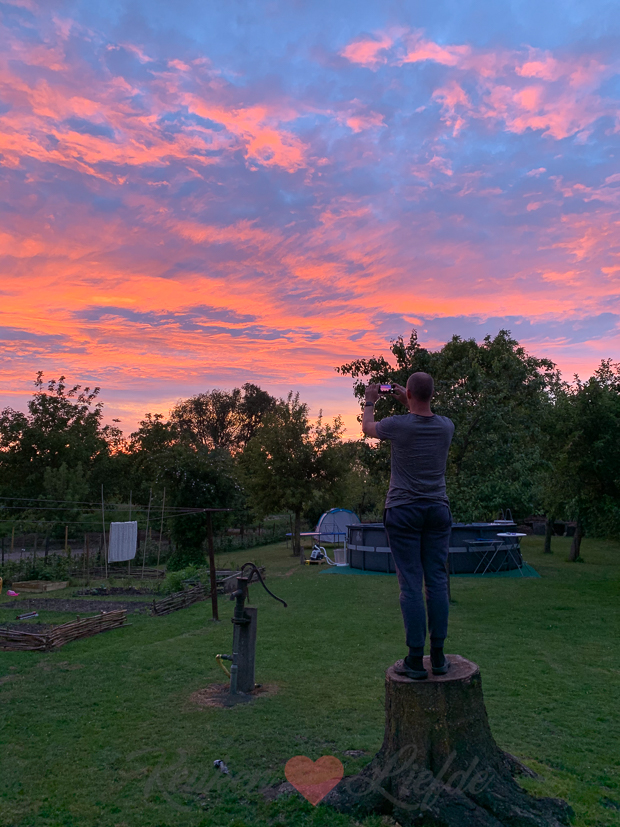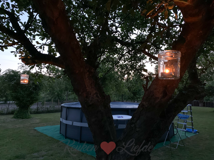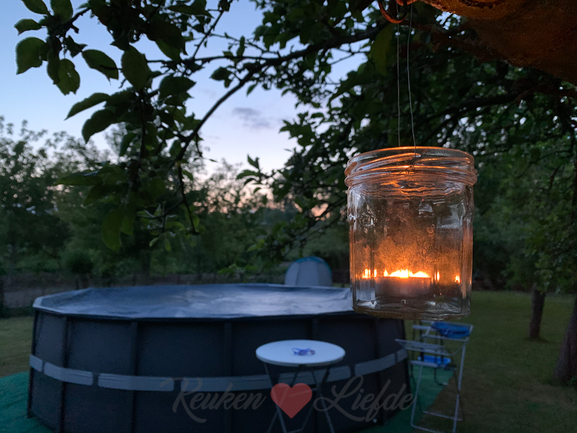 Het is een heerlijke, warme avond en we zitten tot elf uur ’s avonds in de tuin. Van lege jampotjes en wat binddraad maakte ik onlangs waxinelichthouders om in de boom te hangen. Dat ziet er ’s avonds zo gezellig uit! Je kunt er ook nog wat schelpenzand in doen!