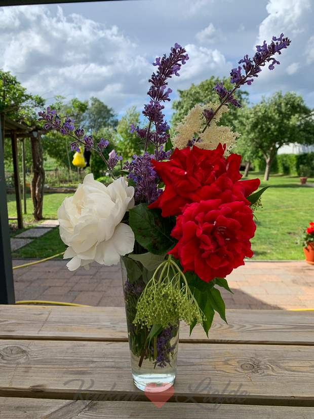 Ella-Marie heeft aan het eind van de ochtend voetbaltraining. Johan werkt in de tuin en ik werk een paar uurtjes op kantoor. ’s Middags komen Johan zijn ouders nog even langs met wat lekkers van de bakker en Ella-Marie speelt met een vriendinnetje. De meiden mochten bij het vriendinnetje in de tuin bloemen plukken voor een boeketje en die hadden ze voor me meegenomen. Hoe leuk is dat! Er gaat niks boven een boeket uit eigen tuin!