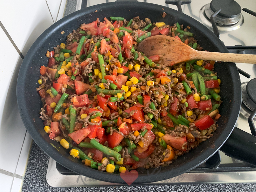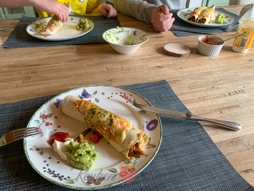 De rest van de zondag rommelen we weer een beetje rondom huis. ’s Avonds maak ik wraps die ik vul met gehakt, mais en sperziebonen, bestrooi met kaas en even gratineer in de oven. Erbij wat guacamole.