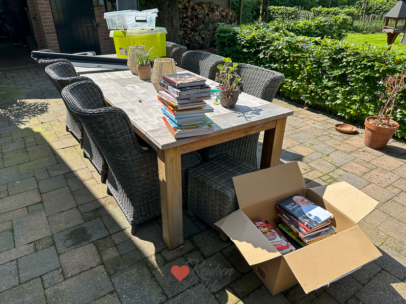 Tweede Pinksterdag. We slapen lekker uit en ontbijten met afbakbroodjes. Daarna stropen we de mouwen op. De zolder en achterkamer moeten worden opgeruimd. Ze stonden vol met dozen waarvan we niet eens meer wisten wat erin zat. En ook dozen vol tijdschriften en kasten vol (kook)boeken moesten eraan geloven. Dat ruimt lekker op. Eind van de dag konden we geen pap meer zeggen en lieten we eten thuisbezorgen.