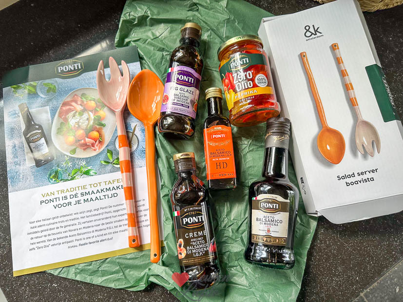 Er kwam weer een leuk pakket binnen van Ponti met verschillende azijnen en ingelegde zoetzure paprika en prachtig porselein saladebestek van Boavista.