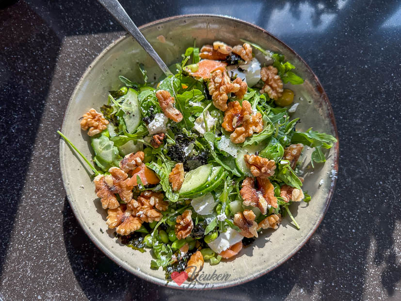 Verder maakte ik weer een aantal nieuwe recepten voor de website waaronder een makkelijke eenpanspasta met witte asperge. Daar had Ella-Marie niet zoveel zin in dus die maakte een lekkere salade voor zichzelf met walnoot en geitenkaas.