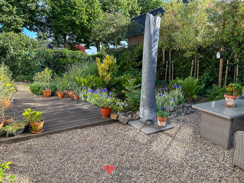 ’s Avonds na het eten ging ik nog even rommelen in de tuin. De paarse irissen zijn nu zo fel en prachtig. En de graszaadjes komen ook steeds beter boven. Elke dag wordt het gazon iets groener. Er kwam ook wat onkruid omhoog dus dat trok ik weer even weg.