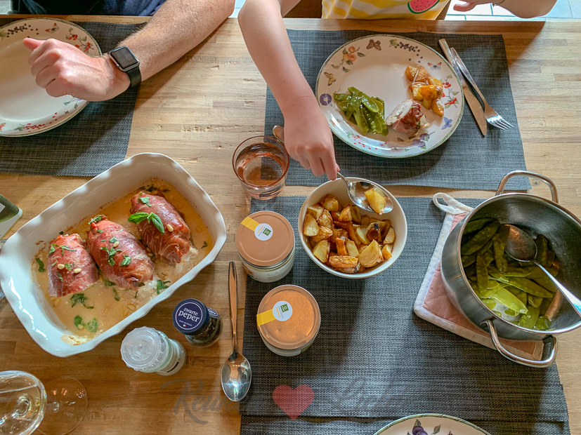De gevulde kipfilet is ons avondeten. Erbij gesmoorde peultjes en geroosterde aardappels uit de oven.