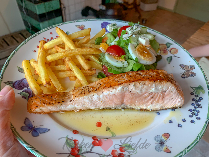 Er is nog lasagne over van gisteren maar ik vind het nooit lekker om twee dagen achter elkaar hetzelfde te eten. (Verwend nest hoor ik mijn moeder nu denken.) ? Ik heb geen idee wat we moeten eten, maar tijdens het boodschappen zie ik drie mooie zalmfilets liggen en besluit dat die het gaan worden. Met een lekkere kropsla-salade uit eigen moestuin en wat Franse frietjes uit de airfryer. Smullen weer!
