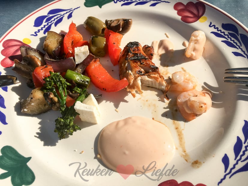 Lui dagje thuis! ’s Avonds steken we de barbecue aan met een grote pan gemarineerde groenten (recept ga ik met je delen!), gemarineerde kipfilethaasje (wij gebruikten deze satémarinade) en garnalenstokjes, stokbrood met zelfgemaakte kruidenboter en homemade cocktailsaus. Dit was trouwens onze eerste barbecue van het jaar maar hopelijk niet de laatste!