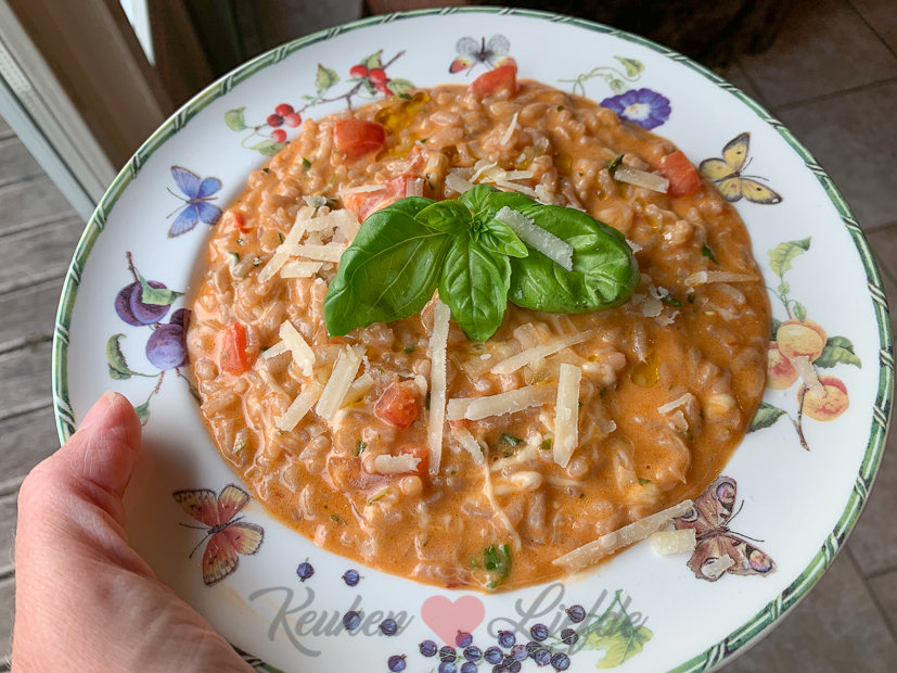 Voor het avondeten maak ik een pan tomatenrisotto met Parmezaan en mozzarella. Echt één van onze risotto favorieten!