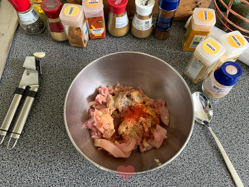 - Reepjes kippendij gemarineren in shoarmakruiden, teentje knoflook, scheutje ketjap manis en scheutje zonnebloemolie