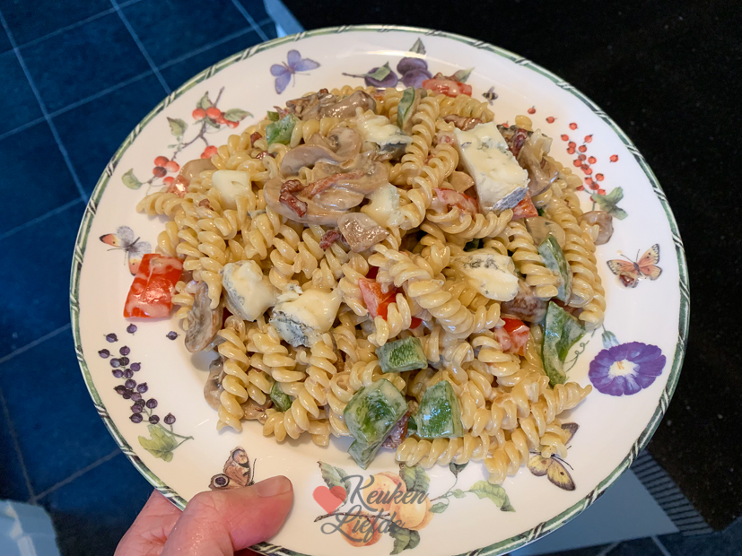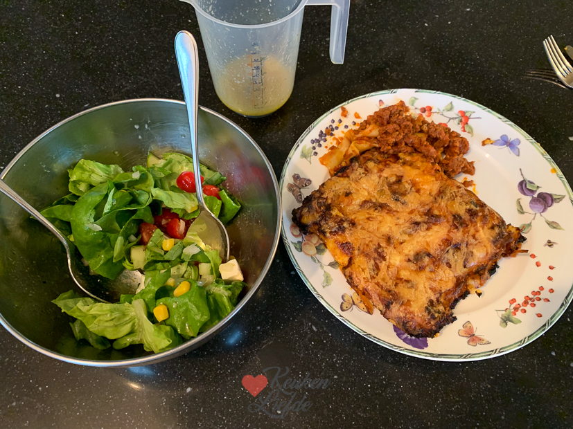 Het is weer een gewone werk- en schooldag als altijd. Johan en Ella-Marie zijn vroeg de deur uit en ik werk weer thuis op kantoor. Op dinsdag heb ik altijd mijn vaste kantoordag en werk ik onder andere dit Kijkje in de keuken uit dat daarna direct online komt. Ik hoef niet te koken vandaag want er zijn nog verschillende kliekjes eten in de koelkast. Omdat er overal nog maar kleine beetjes van zijn, eet iedereen ’s avonds iets anders. Ik maak met het allerlaatste kliekje bolognese- en bechamelsaus nog een kleine portie lasagne voor mezelf en maak er een salade bij. Heb gruwelijk zitten smullen.