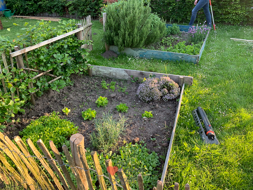 - Sla, radijsjes, rucola, tijm, peterselie en in de achterste bak rozemarijn, pastinaak, munt, bieslook en rabarber