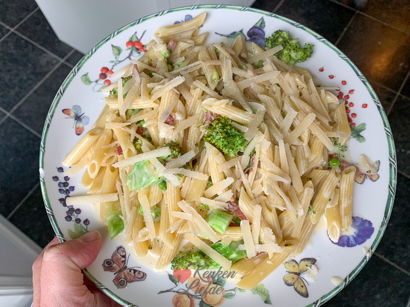 Tweede Pinksterdag. Ik sta al vroeg in de keuken om taart te bakken. Mijn ouders en broers komen begin van de middag even op de koffie en bij de nieuwe keuken kijken. Ik had taart bij de koffie beloofd en in het kookboek La vita è dolce had ik een lekker recept gezien dat ik wilde uitproberen: een notentaart met chocoladeglazuur. De taart zag er prachtig uit dus maakte ik er snel nog een paar foto’s van voordat de visite kwam. Ondertussen dat ik taart aan het bakken was, maakte mini me warme havermoutpap voor zichzelf als ontbijt. Tijdens een speurtocht door de kelder had ze een pak havermout zien staan (net een schatkist zo’n opgeruimde kelder) en toen ik haar vertelde dat je daar warme ontbijtpap mee kunt maken wilde ze dat uitproberen. Afgetopt met stukjes appel en kaneel een appetijtelijk ontbijt, maar helemaal om is ze nog niet. (Ik kan er ook nog steeds niet aan wennen.) De taart was wel een groot succes dus het recept ga ik met jullie delen. Moeders had nog haar befaamde vishapjes gemaakt en meegenomen die die kwamen na de koffie en taart ook nog op tafel met een glaasje bubbels erbij. ’s Avonds maakte ik pasta voor het avondeten met spekjes, broccoli en roomsaus. Volgens Johan was het de lekkerste pasta die ik sinds lange tijd maakte. Pardon?! Recept is simpel. Voor 3 personen: 125 g spekreepjes langaam uitbakken tot goudbruin in grote koekenpan. Dan 1 gesnipperde ui erbij en kort meefruiten. Ondertussen 300 – 350 g penne beetgaar koken in pan. Mok pastakookvocht uit de pan scheppen en opzij zetten. Dan 2 uitgeperste knoflooktjes, 1 (kleine) fijngesneden broccoli en verkruimelde kippenbouillontablet erbij en even meebakken. Scheutje pastakookvocht (niet alles) erbij en zachtjes koken tot broccoli beetgaar is (ik gooide er ook nog een hand diepvriesdoperwten bij toen de broccoli bijna gaar was). Afblussen met 250 ml slagroom, 125 g crème fraîche, handje geraspte parmezaan, klontje roomboter (en optioneel stukje gorgonzola) erbij en goed doorwarmen tot kaas en boter gesmolten zijn. Eventueel extra kookvocht toevoegen als de saus te dik of te zout is. Dan pasta afgieten en door de saus roeren. Smakelijk.