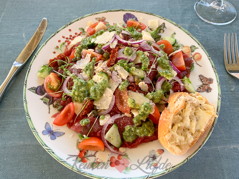 ’s Avonds eten we de carpacciosalade met pestodressing die ik vanmiddag maakte voor KL. Met wat stokbrood erbij een heerlijke en makkelijke maaltijd!