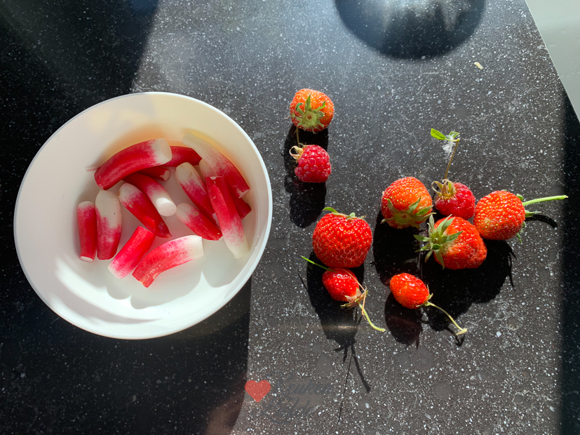 Ik heb vandaag een kookdag en maak weer een aantal lekkere recepten voor de website. Als ik daarmee klaar ben ik ga ik in de wc alvast wat gaten dichtstoppen en afkitten. Als Ella ’s middags uit school komt heeft ze zin in iets lekkers en stuur ik haar de moestuin in. Snoepen met radijsjes, aardbeien en frambozen is niet verkeerd. Voor het avondeten maak ik tomatenrisotto en serveer die met de gevulde kipschnitzels die ik eerder op de dag had gemaakt.