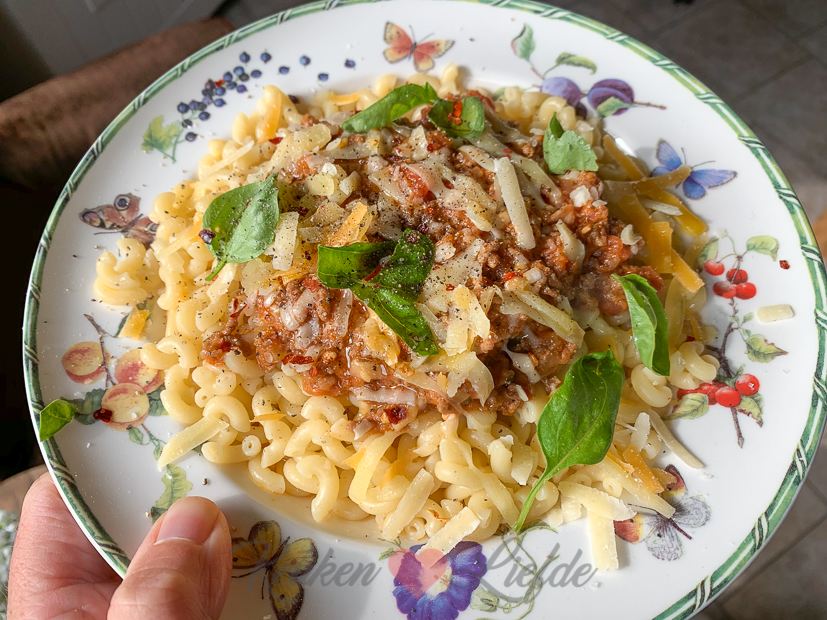 Op het menu vandaag: macaroni met bolognesaus! (Ik maak altijd deze bologneseaus). Tijdens het koken kwam ik erachter dat ik geen passata had, dus gebruikte ik een pak gehakte tomaten en 2 eetlepels tomatenpuree. Was ook heerlijk.