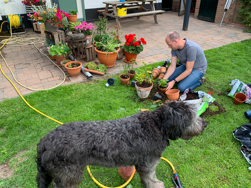’s Middags halen Johan en ik nog wat plantjes in het tuincentrum om in potten te zetten. Ons motto: je kunt nooit genoeg potten hebben! ?