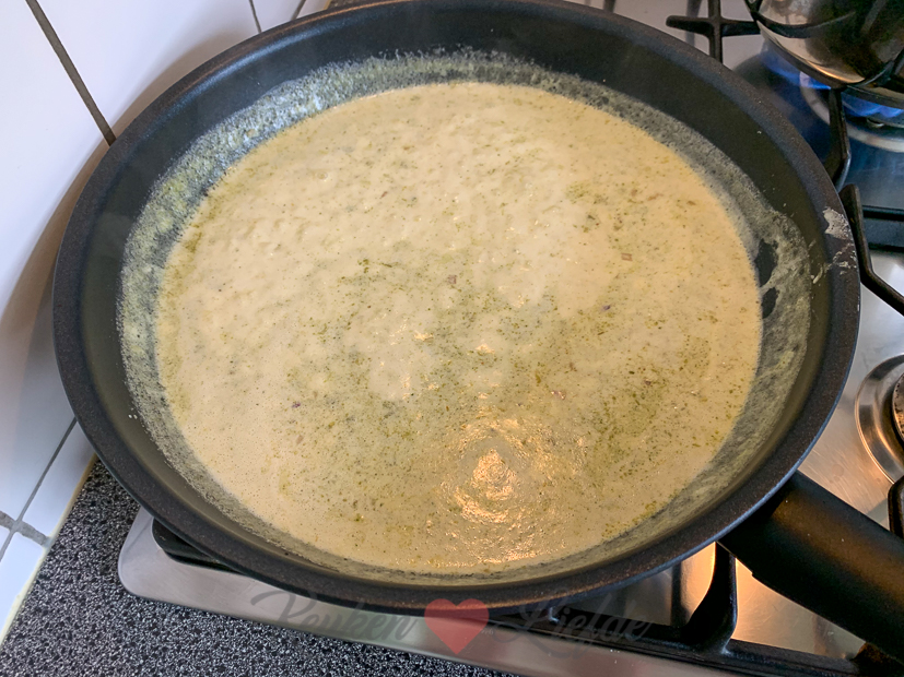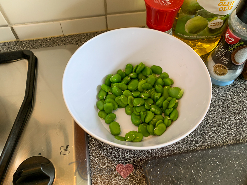 Voor het avondeten maak ik een romige pestosaus (paar zelfgemaakte eetlepels pesto verwarmen met 200 ml slagroom) met spaghetti. In de vriezer vind ik nog wat tuinbonen die ik kort even kook en dubbel dop en uit de moestuin pluk ik twee courgettes die ik in plakjes snijd en rooster in de oven. Simpel en heerlijk maaltje!