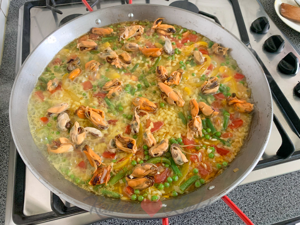 ’s Avonds eten we paella met mosselen. De mosselen had ik eigenlijk gekocht voor afgelopen zaterdag of zondag, maar toen hadden we er geen zin in. Omdat ze maar tot gisteren houdbaar waren hebben we ze gisteren alvast gekookt. Terwijl Johan de gekookte mosselen uit de schelp haalt, bereid ik alvast de paella in het bewaarde mosselvocht. De laatste paar minuten leg ik de mosseltjes bovenop de paella om ze op te warmen. Het lekkerste is natuurlijk om de rauwe mosselen gewoon met schelp en al bovenop de paella te leggen en dan te laten garen, maar vooruit, zo kan het ook. Ook paella maken? Hier vind je verschillende recepten.