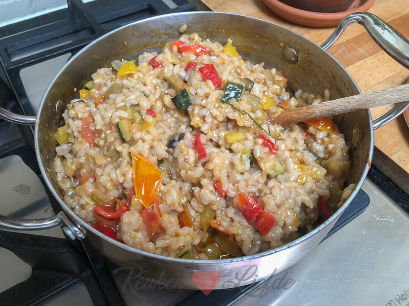 Johan haalt Ella-Marie vandaag weer op bij mijn ouders als hij uit zijn werk komt. Als Ella ’s avonds op bed ligt (ze heeft bij mijn ouders gegeten) maak ik voor Johan en mij risotto met kliekjes die ik in huis heb. Van een halve aubergine en courgette, wat paprika en tomaat maak ik ratatouille (zonder twijfel het favoriete groentegerecht van mij en Johan!) en ik maak een eenvoudig tomatenrisotto met kippenbouillon. De ratatouille roer ik vlak voor serveren door de risotto. Het beste van twee werelden. Mmmm… smullen was dit! Ik dacht dat ik een soortgelijk recept al op KL had gedeeld maar dat blijkt niet zo te zijn.