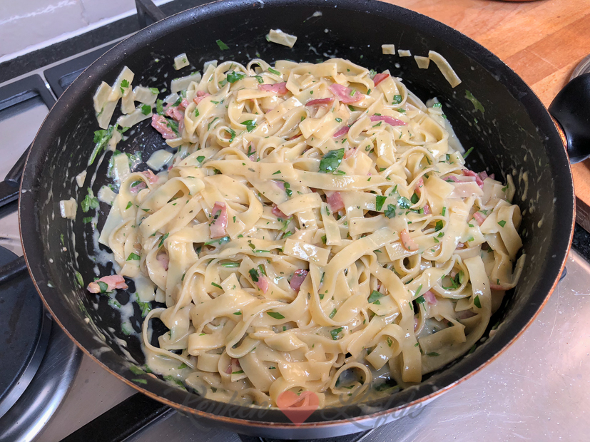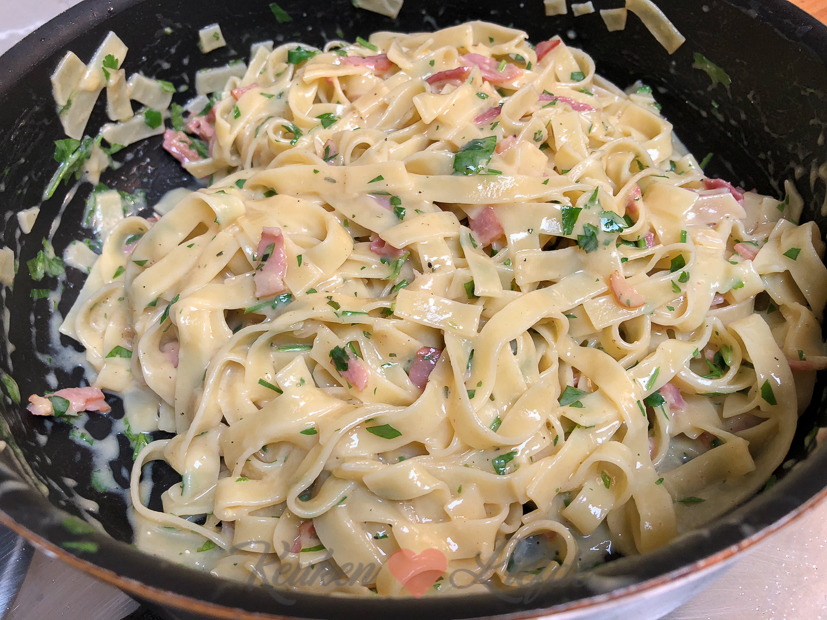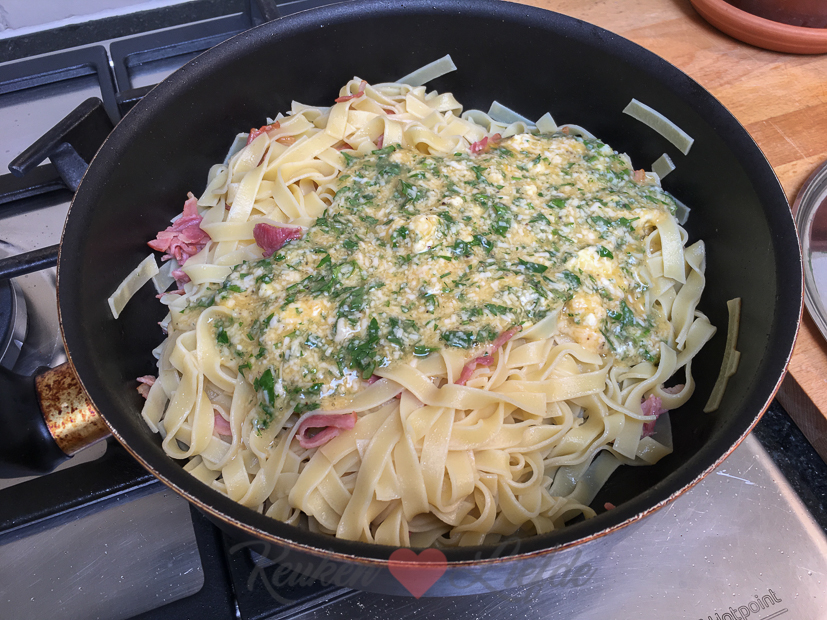 Vandaag kook ik weer met kliekjes. Voordat we op vakantie gaan en gaan verhuizen wil ik de kelderkast een beetje leegruimen. In de kelder vind ik een half pak tagliatelle en 3 eieren en in de koelkast ligt gerookt ontbijtspek, oude geitenkaas en peterselie. Alle ingrediënten voor een heerlijke carbonara!