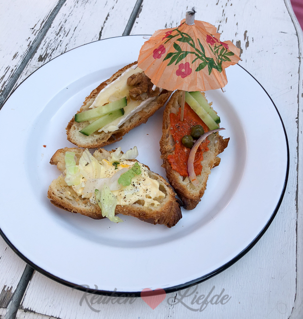 Geïnspireerd door onze lunch in de stad gisteren ontbijten Ella en ik vandaag met mini-croissants met drie soorten beleg. Mét parapluutje natuurlijk.