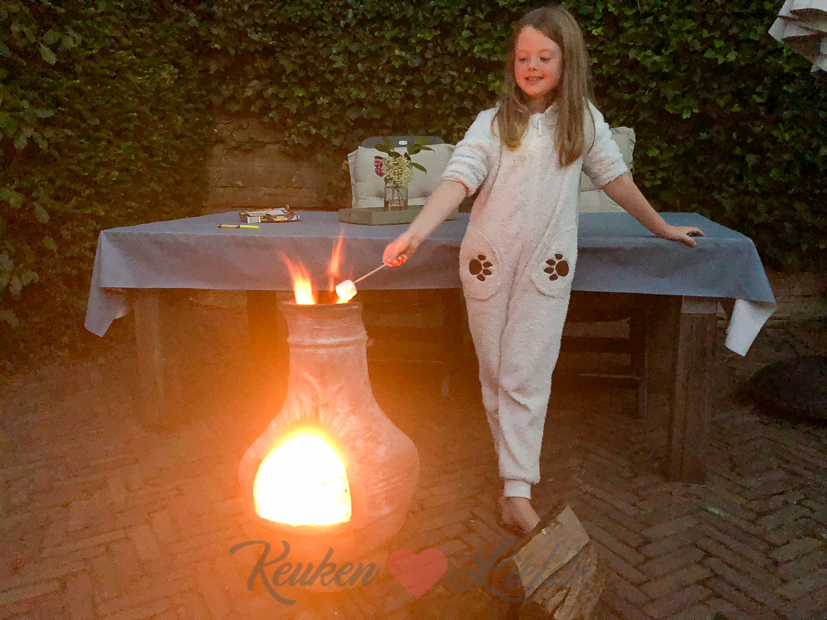 Omdat Ella-Marie niet kan slapen komt ze even naar beneden om wat drinken te pakken. Ze ziet dat Johan en ik buiten in de tuin bij het vuur zitten en vraagt of ze erbij mag komen. Vooruit, heel eventjes dan. Omdat het wat frisjes begint te worden trekt ze snel haar berenpak aan. Ik pak snel een zak met marshmallows en wat houten prikkers, want ondanks het aanhoudende mooie weer komen dit soort avonden – met z’n allen buiten bij het haardvuur – toch niet zo vaak voor.