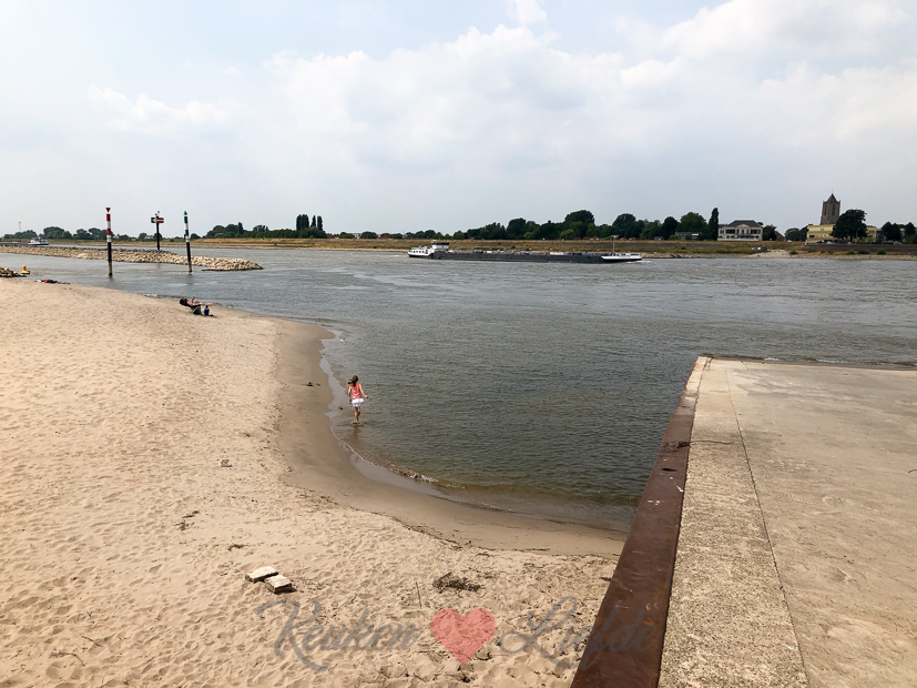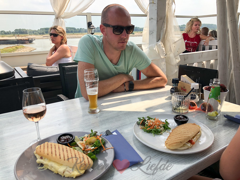 Op de terugweg naar huis moeten we even wachten op het pondje en grijpt Ella haar kans om over het waalstrand te lopen. Weer aan de overkant strijken we neer op het terras van restaurant Bellevue voor een kleine lunch. Met z’n driëen delen we twee panini’s.