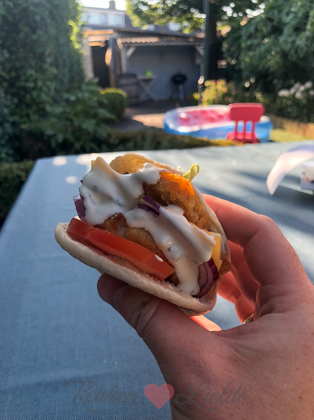 De rest van de dag chillen we achter in de tuin. ’s Avonds kookt Johan. Hij vult pitabroodjes met krokante kipschnitzel, een rostirondje, rauwkost en knoflooksaus. Erg lekker!