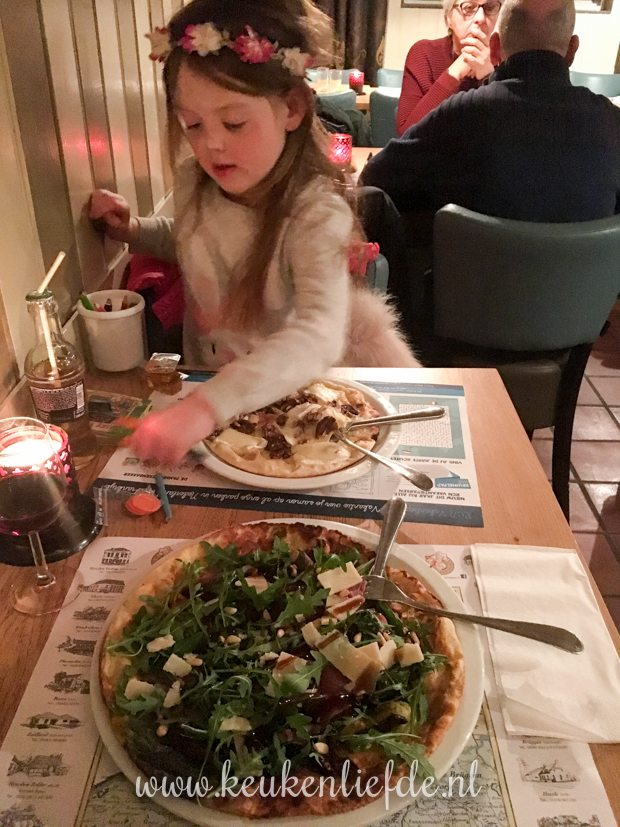 Ella-Marie neemt een pannenkoek met brie, walnoten en honing. Ik kies de pannenkoek met carpaccio, rucola, zongedroogde tomaten, pijnboompitjes, Parmezaan en balsamicodressing. Lekker!