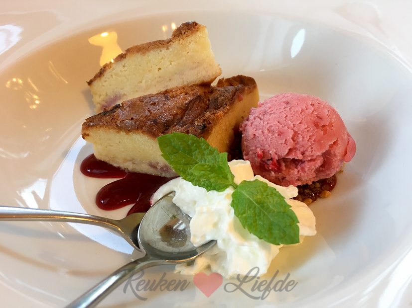 - Cheesecake met sorbetijs en frambozencoulis