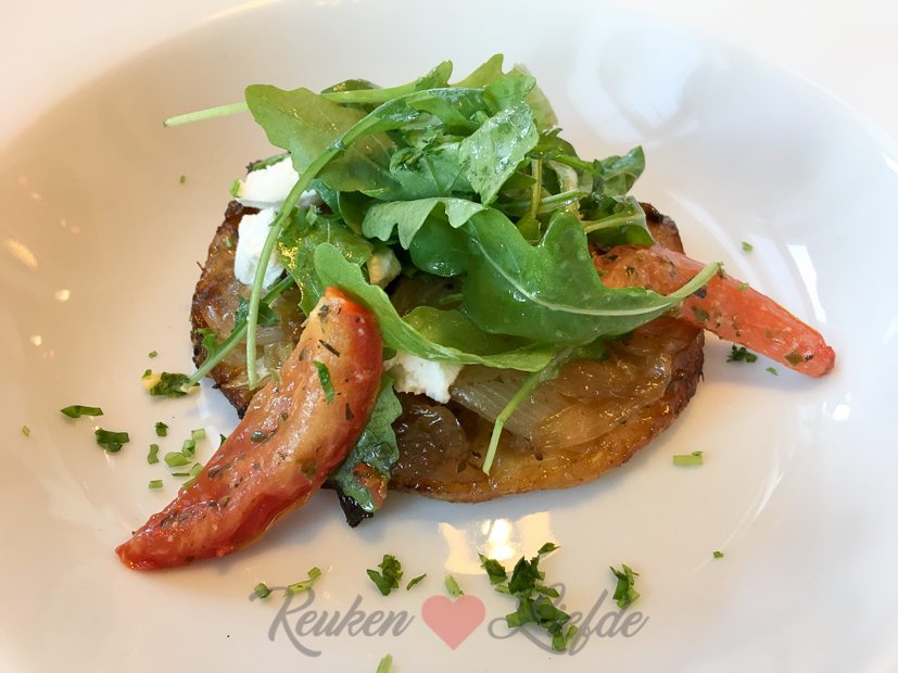 - Tarte tatin van sjalot daarbij geitenkaas, oregano & rucola