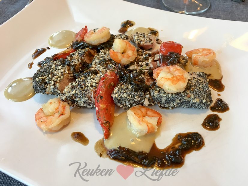 - Rosbief van tonijn met zwarte peper & gamba en basilicum olie