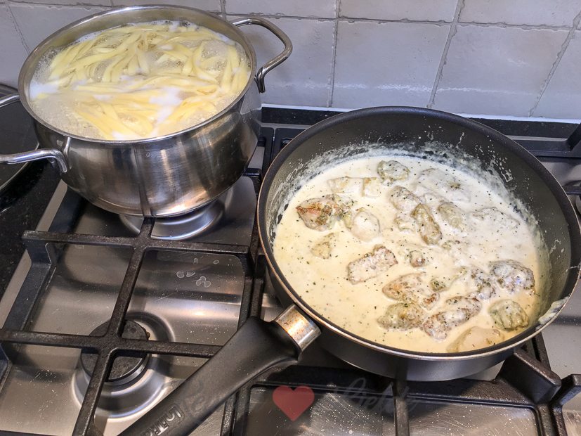 - Penne al forno, penne met kipfilet, uien, champignons, ham, gegratineerd met kaas voor mij